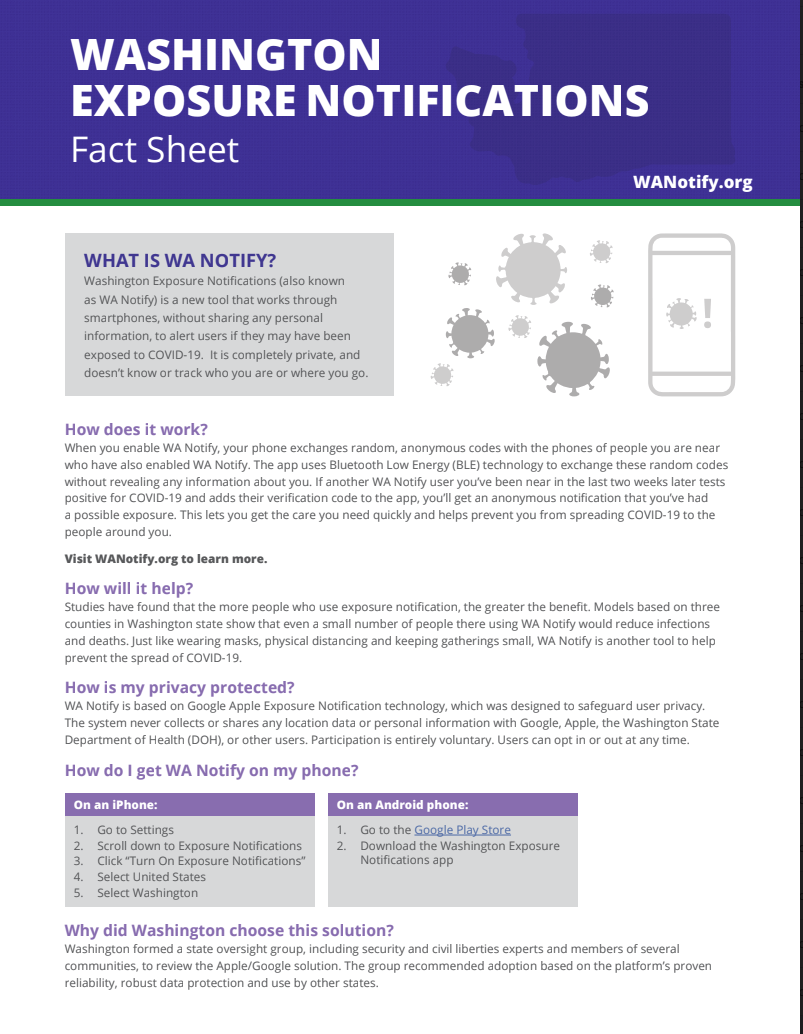 Washington State Exposure Notification exposure Mar 1 Written By Praece Consulting Fact Sheet PDFs are available in the following languages. Please click the language to open the PDF in that languageEnglishSpanishSimplified ChineseBurmeseAmharicArabicVietnameseUkrainianUrduThaiTigrinyaTeluguTamilTagalogRomanianSomaliSamoanRussianPunjabiPortuguese exposureexposure notificationWashington DOHmultilingual Praece Consulting
